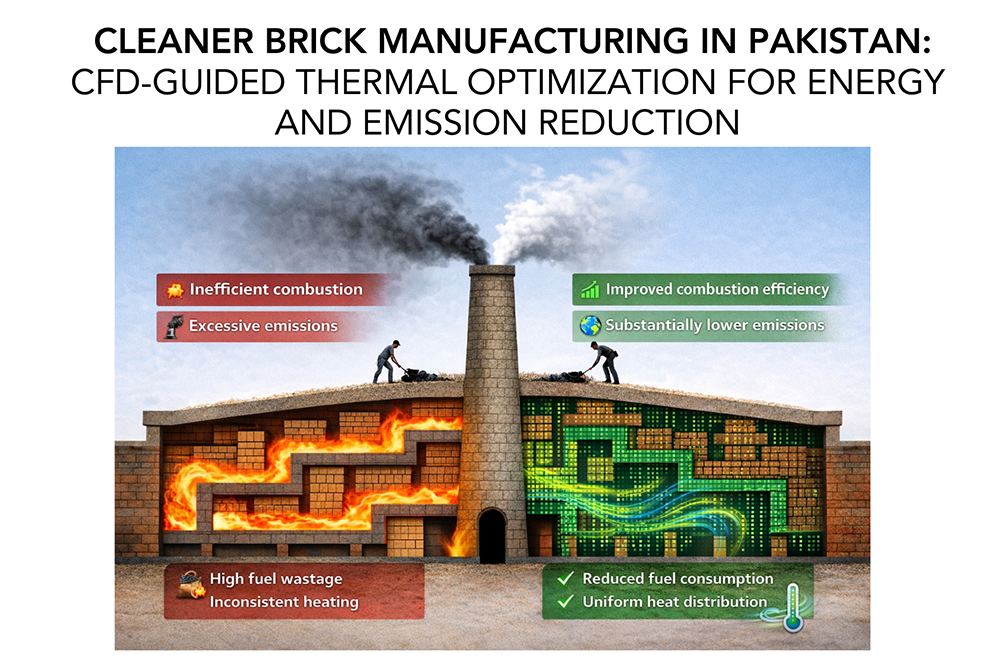 Brick kilns are a major contributor to air pollution and smog in Pakistan, largely due to inefficient combustion and poor heat distribution within existing kiln designs. This project aims to address these challenges through the use of advanced Computational Fluid Dynamics (CFD) to optimize brick-stacking configurations and improve airflow and thermal uniformity inside zig-zag kilns. By combining simulation-driven design with laboratory experiments and real-world industrial validation, the research seeks to reduce fuel consumption, improve the yield of high-quality bricks, and significantly lower harmful emissions such as fine particulate matter (PM₂.₅). In parallel, a low-cost wet scrubbing system will be developed to further capture pollutants before they are released into the atmosphere. The project offers a practical, low-disruption pathway to cleaner brick production—demonstrating that environmental sustainability and industrial profitability can go hand in hand. With the potential to improve air quality, enhance energy efficiency, and support regulatory compliance, this work aims to set a new benchmark for sustainable manufacturing in Pakistan’s construction sector.