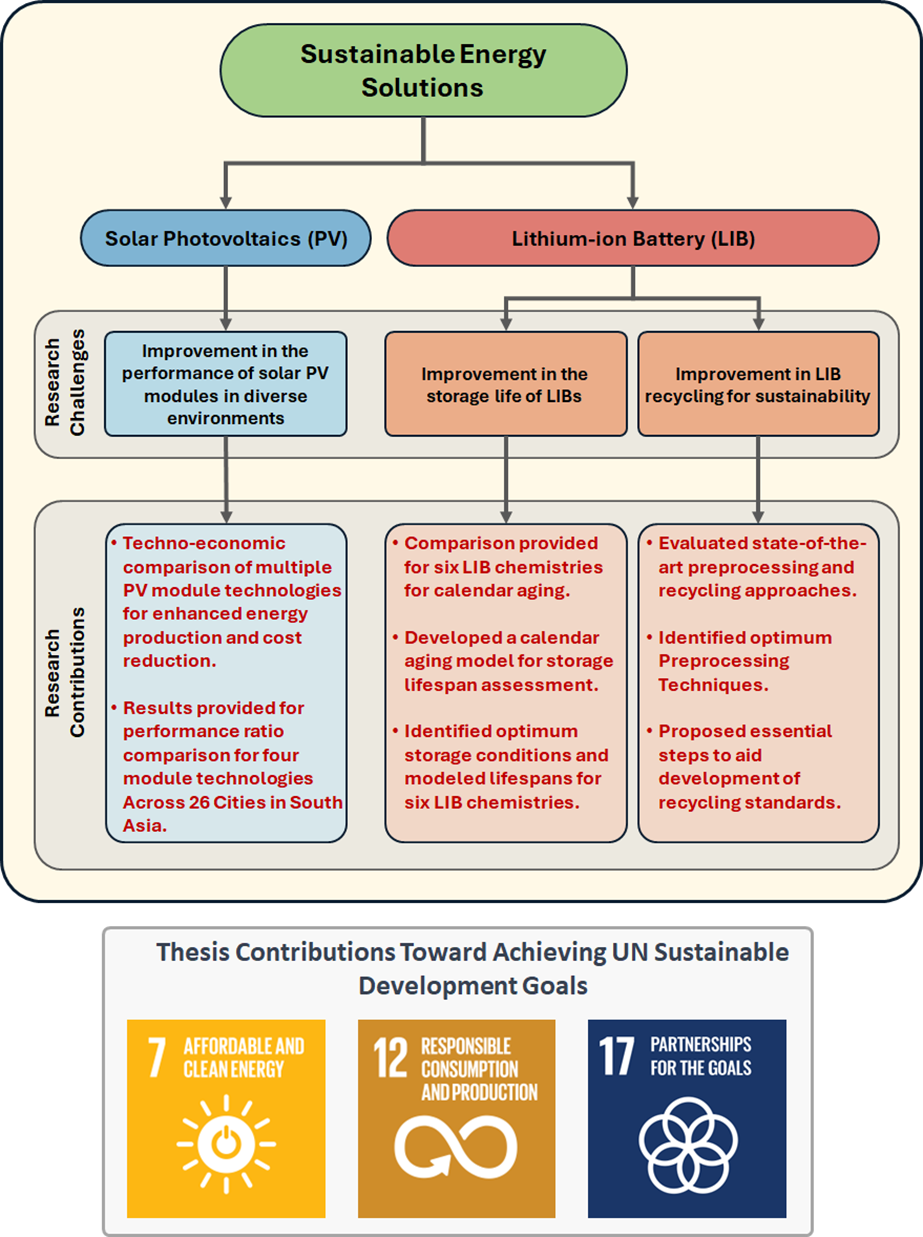 Climate change and energy sustainability are global concerns, and research and development efforts are directed towards the development of sustainable energy solutions (SES). Renewables, such as solar photovoltaic (PV) and lithium-ion batteries (LIB) are two major technologies that can lead the global transformation towards an eco-friendly energy future. The thesis focuses on both solar and LIBs and addresses various key research challenges, each detailed in individual chapters.